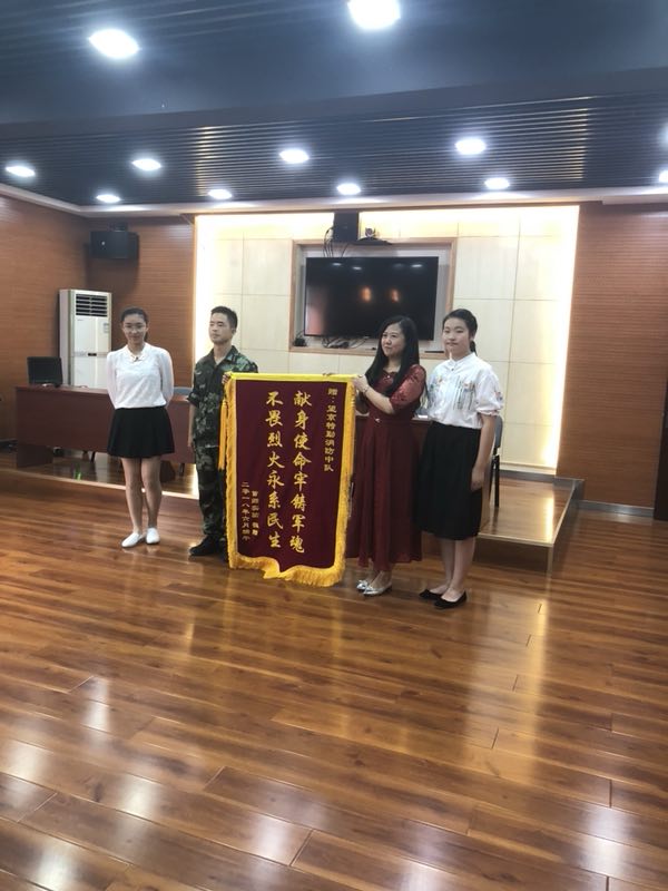 但是更让战士们没想到的是,我们还为他们准备了惊喜。姚老师为消防战士们献上了锦旗,它寄托着我们对于战士们的敬佩与感谢;心灵手巧的吴昊彧还特地给每一个战士做了五彩斑斓的香包作为纪念和礼物。它们更包含着我们最最真挚的祝福:端午的祝福,“家人”的祝福。战士们一个个鞠躬致谢,感动不已,连连赞叹。